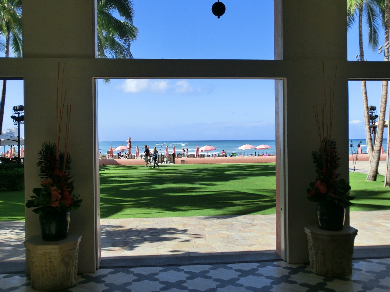 シェラトンワイキキの隣りのロイヤルハワイアン(ピンクパレス)を見学。シェラトンよりも人が少なく、時間がゆっくり流れている感じです。 -