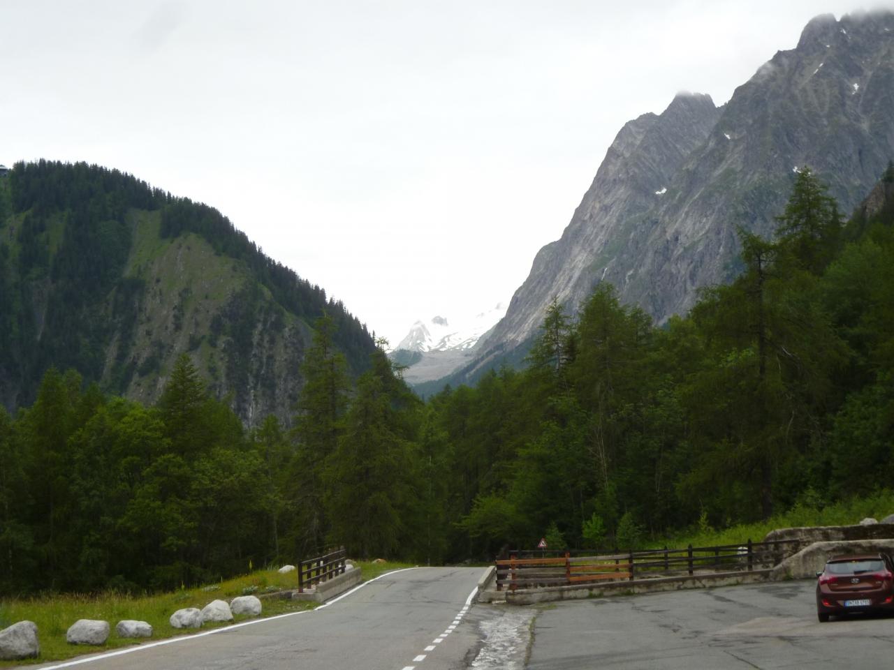 天気はあまりよくありませんが、フェレの谷をドライブすることにしました。クールマイユールを過ぎてフェレの谷に入ると、川に沿って道路が続き、左側はグランド・ジョラス南壁が続きます。氷河も見えます。緑の木々と草原に花が咲き乱れ、川で鴨の親子が泳いでいたり、魚釣りをしている人、キャンプをしている人、ロッジに泊まって散策をしている人などがいます。気持ちがいいです。ここに泊まってトレッキングするのがいいでしょうね。