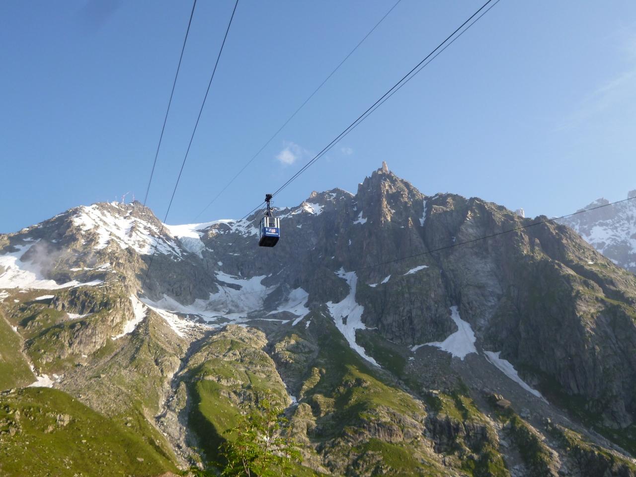 次の日、朝目を覚ましたらいい天気になっていました。山もきれいに見えています。これは観に行かねばと7時に出かけました。昨日は雲に隠れていた山がきれいに見えます。もう一度フェレの谷をドライブ。周りの山々を見てから、ラパレードからモンテビアンコロープウエイに乗り途中のパビヨン・デュ・モン・フレティ2173mで降り、サウスウレア高山植物園へ。高山植物がくさん咲いていました。又奥にモンテビヤンコ、手前にある尖った岩山は「巨人の歯」と呼ばれるロッククライマー憧れの山。グランドジョラスと並ぶ山々がきれいです。眼下にはフェレの谷、クールマイユールの町並み。