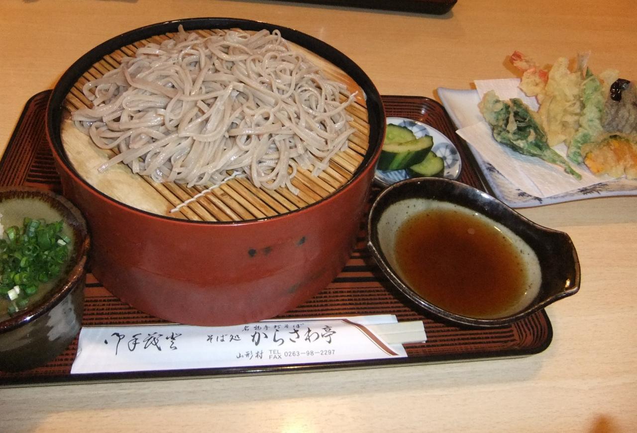 市内で食べようかと思ったのですが、ガイドブックで山形村に「唐沢そば集落」という場所があるのを発見。