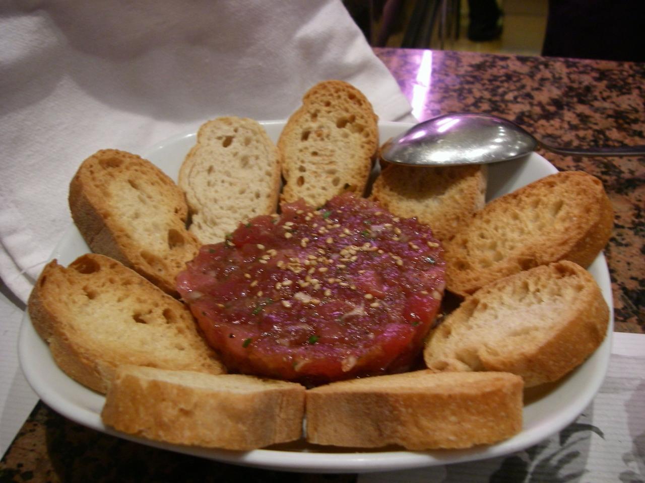 2種類の生ハム(19.8ユーロ)、店頭に出ているものから試食してから選べる。さしの入った生ハムは口の中で溶けていく。グラスワインは1.7ユーロ。ハモン・イベリコを食べるには最適の店。
