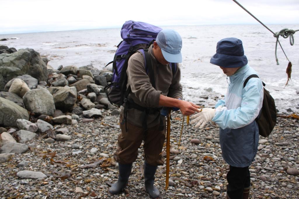 石田さんの案内で、番屋の立ち並ぶ北浜をさらに北へと海岸沿いに向かいました。デイキャンプとして、石田さんにカレースープとフランスパン、豚肉の燻製にスライス玉ねぎをご馳走になりました。世界自然遺産の真っ只中での石田さんこだわりのご馳走での昼食もまた何物にも代え難い体験でした。