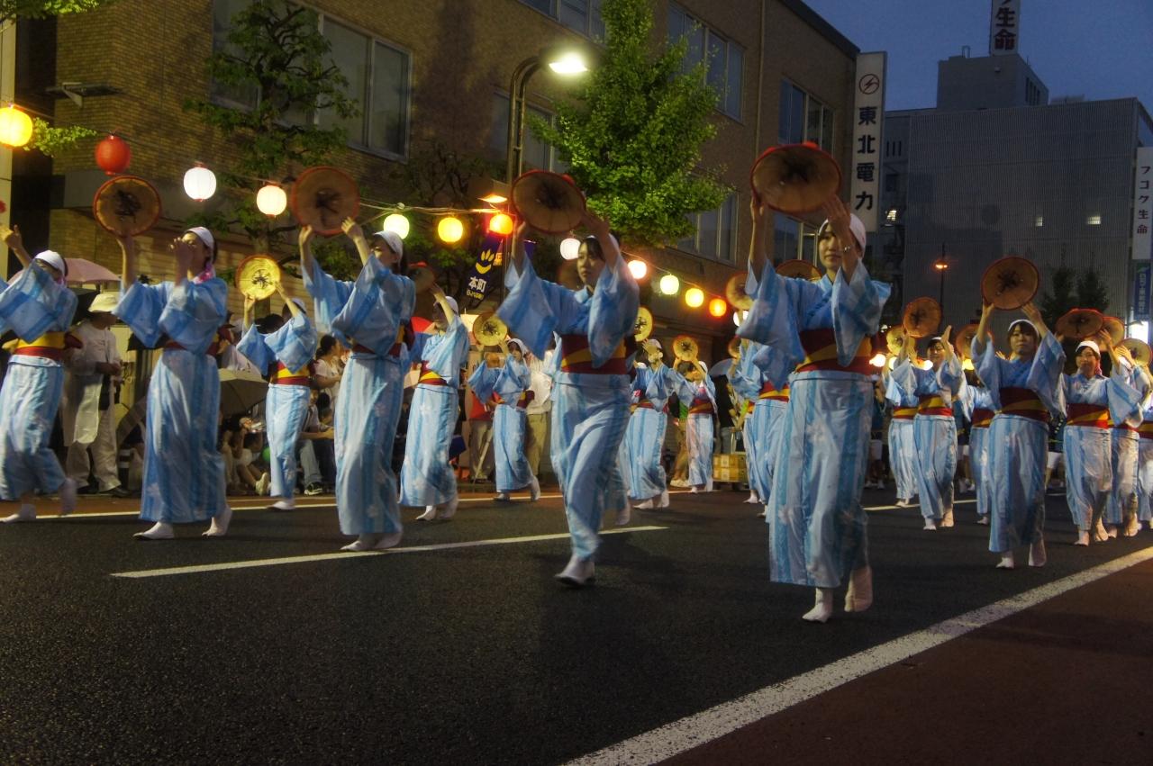 山形の夏祭り、花笠は今回初体験。雨が降り出したりして、ちょっと悪条件でしたが、大集団のパレードの華やかさは十分堪能できました。動きをそろえた美しさはさすがですし、汗が滴るような笠まわしの豪快で激しい動きにも目を見張りました。正直言えば、演出が少し勝ちすぎているような感がなくもないですが、延々と続く参加者の多さは山形を代表する祭りであることを証明していると思いました。
