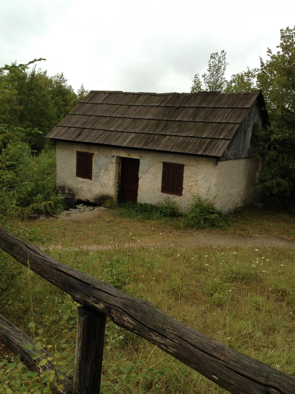 右手に白い小屋がみえたら そこを左にはいっていきます