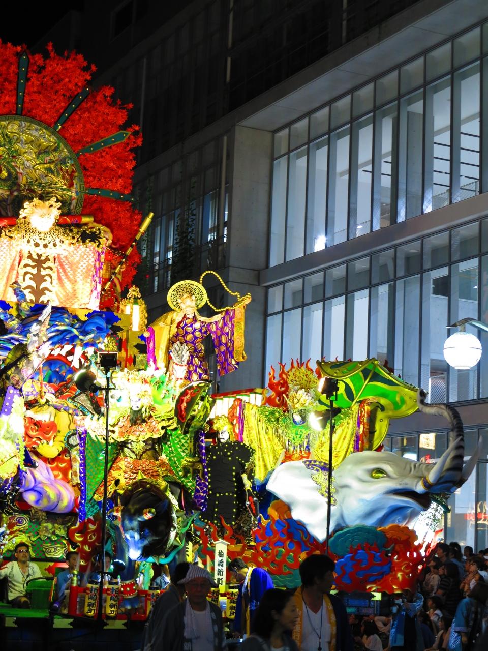 当初は1体の人形を乗せる程度だったものが、明治の中頃より物語を表現する山車に変化し、昭和50年代頃から徐々に仕掛けが施されるようになった。近年では煙が吹き上がるなどの仕掛けもある。山車は町内ごとに製作されるが、これは明治時代に大澤多門が発案したものと言われている。 (フリー百科事典『ウィキペディア(Wikipedia)』より引用)