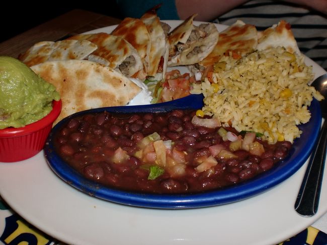 チキンとソーセージのケサディア、フライドチキン、バドワイザー、アイスティー×2、ソーダ+チップ 35.65ドル