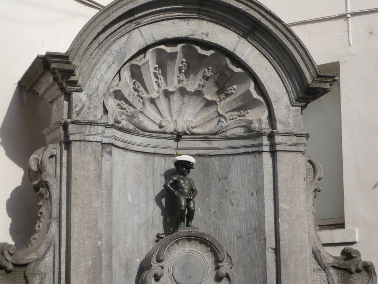 有名な小便小僧。今日は帽子をかぶっています。街を歩いている女子高生何人かがこれと同じ帽子をかぶっていました。何の帽子なのかはわからず・・・