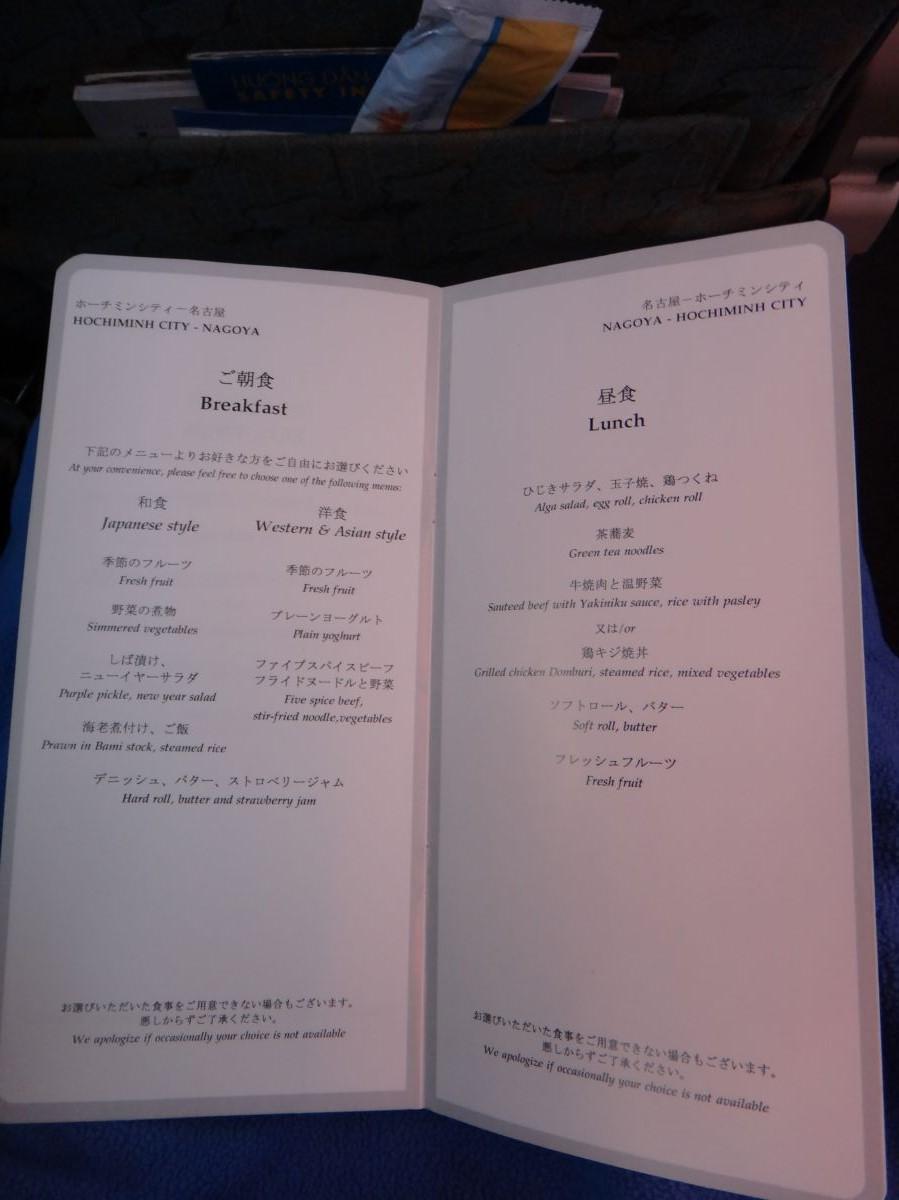 離陸してしばらくすると、アオザイを着たCAさんが、機内食メニューを配りに来た