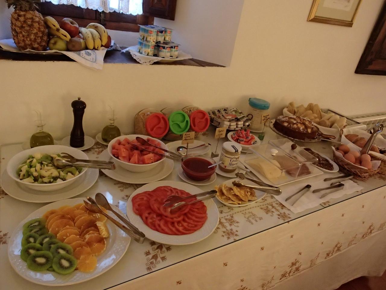 トマト、ハム、チーズ、フルーツ、ヨーグルト、シリアル、いろんな種類のパンとケーキ&飲み物色々。