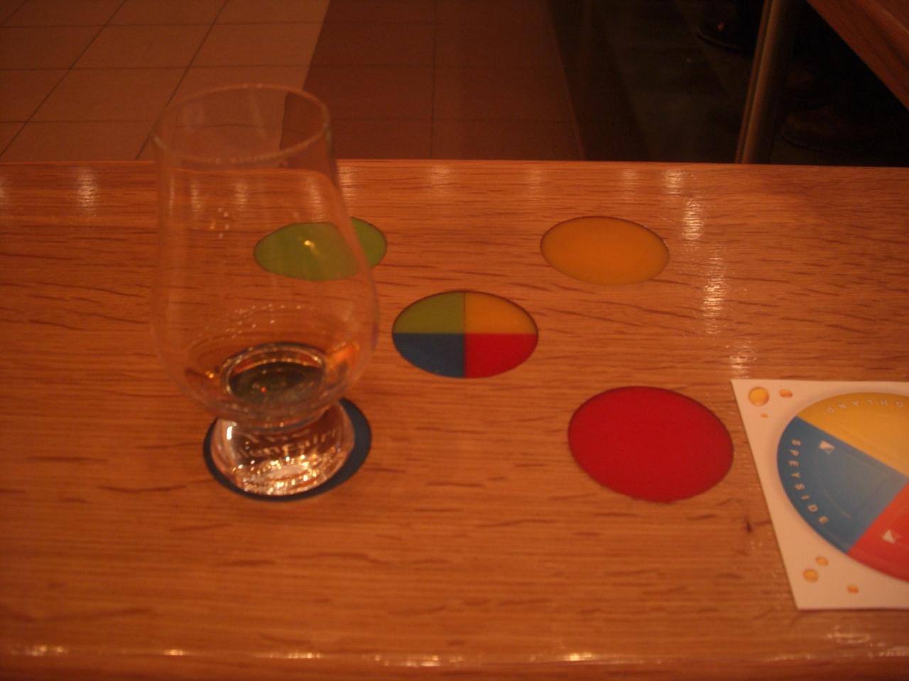 写真の右側に「カード」が写っていますが、青がスペイサイドのウィスキーをイメージさせる香りが、黄にはハイランド、赤がアイラ、そして写真には写っていませんが、緑はローランド。お兄さんの説明を聞きながらその香りを確かめ、最後に最も気に入った所にグラスを置くと、その地域のウィスキーを少し試飲させてくれるというシステムです(私はスペイサイドのウィスキーを飲ませてもらったというわけ)。 -