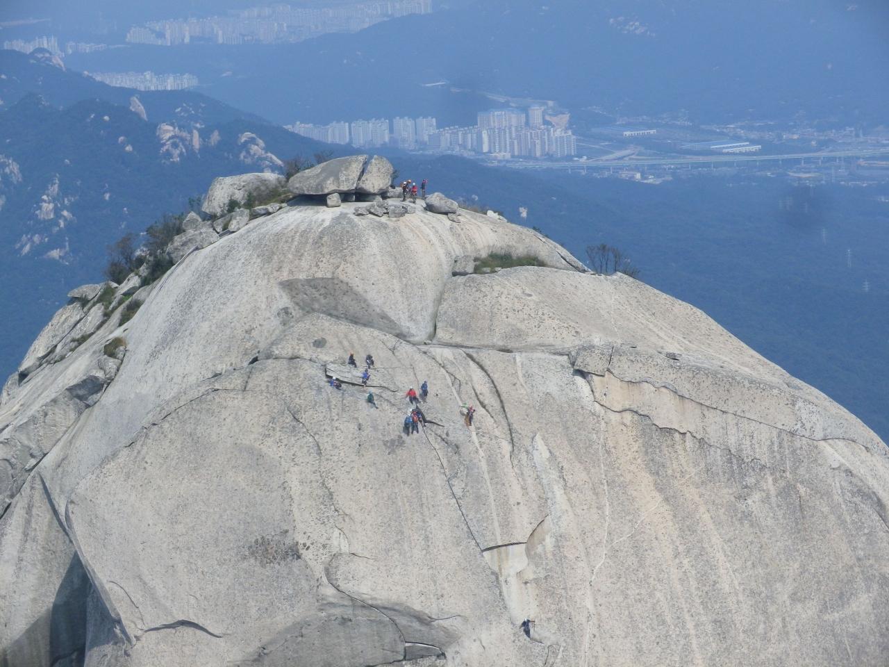 上に人がたくさんいる場所が北漢山・白雲台頂上(836.5m)です