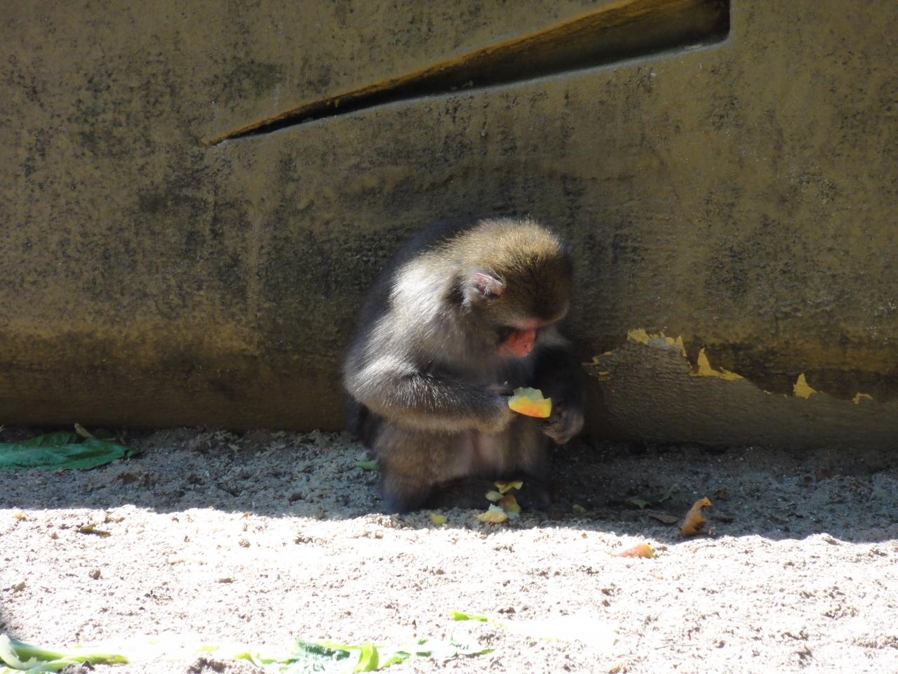猿山見学。上野動物園みたいな猿山がある。小猿がお食事中。