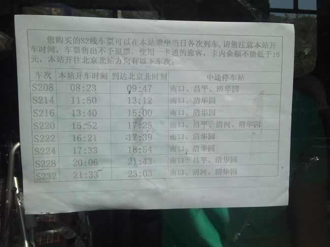 これがS2列車。私が乗ったのは10:57分発のS209です。交通カードだったおかげで55分に飛び込みましたがホームが長くてダッシュでした。目的地は、終点ではなく八達嶺站(bā dá lǐng zhàn )という駅で12:10着でした。なお、9:02発10:10着のS201だともっと楽しめるでしょう。そうそう値段は6元です。