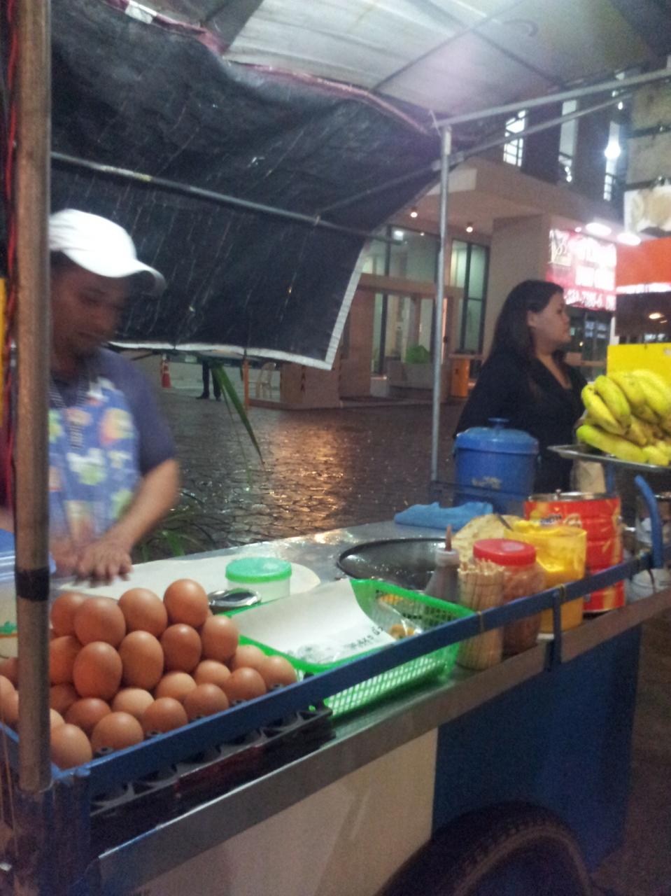 クレープみたいに薄く広げた生地のなかにバナナと溶き玉子を入れて揚げ焼きにして、練乳とグラニュー糖をかけたもの。
