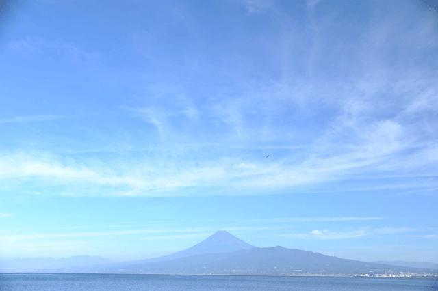 出会い岬から見えた海越しの富士山。