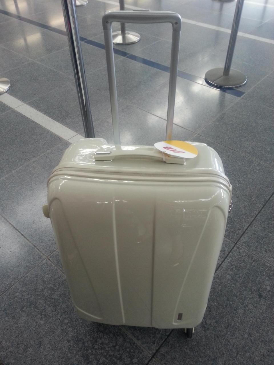 今回共に旅するスーツケース。行きは片面の3分の2くらいしか荷物が入ってません。帰りのために荷物は最小限に。 -