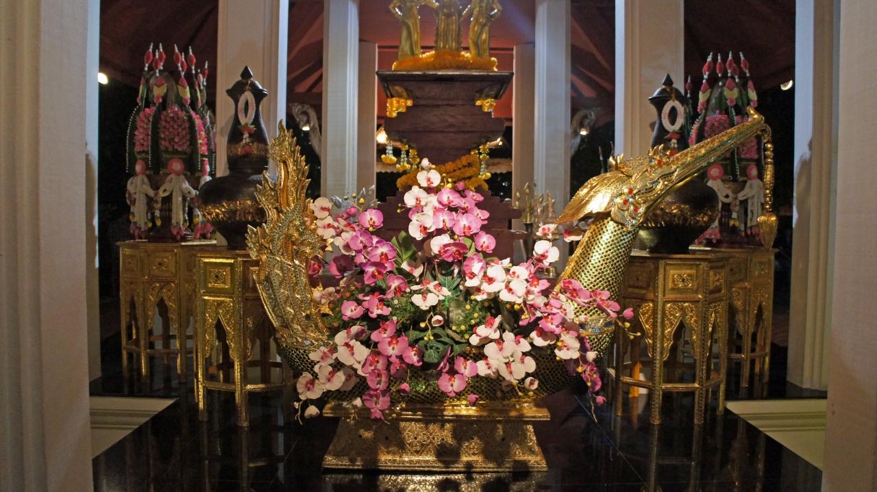 ベンジャロン焼のような黄金の花器に蘭の花がこれでもかと生けられてあります。
