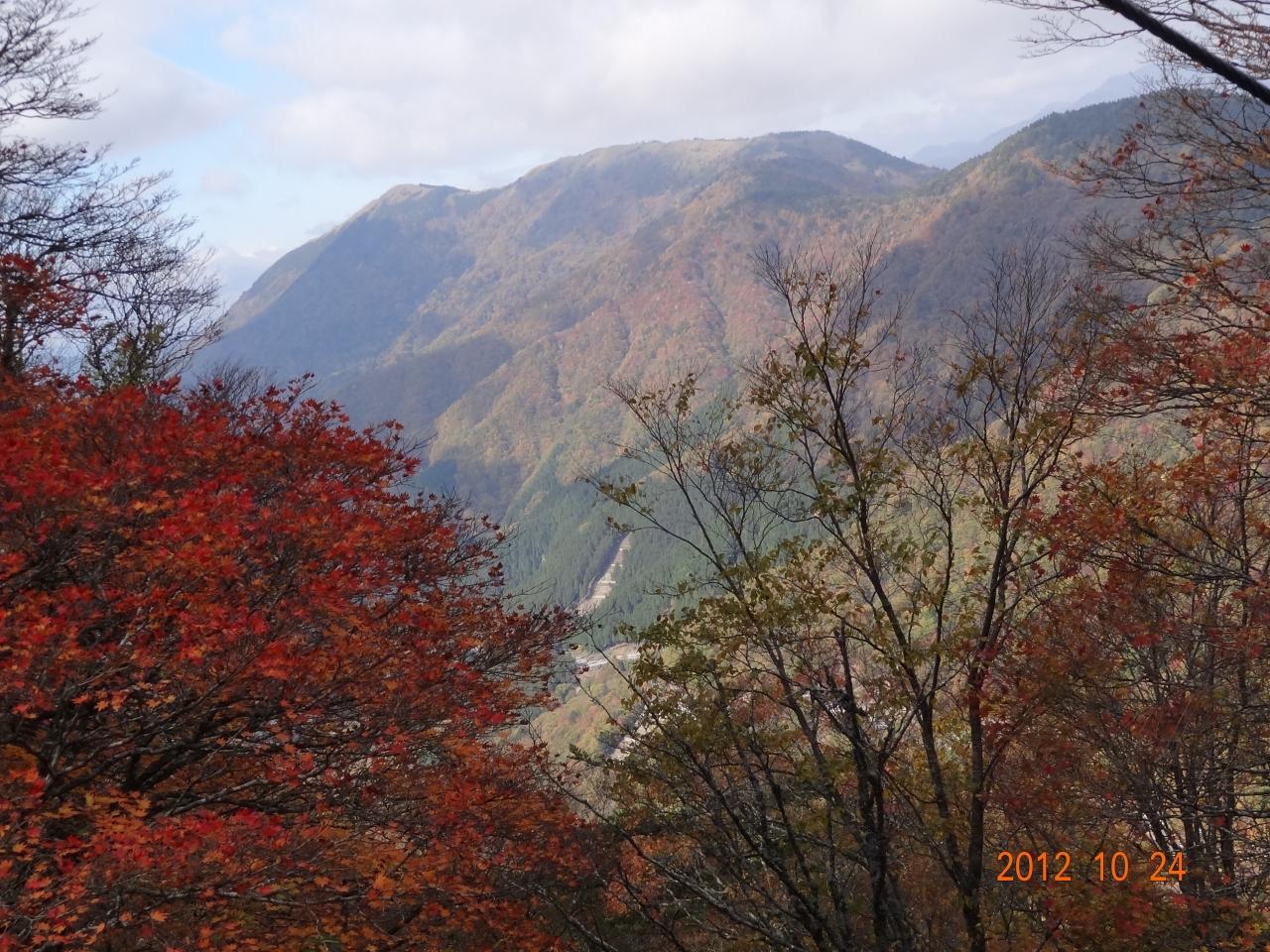 次郎岌峠の東面の紅葉が美しく、その紅葉の先には、ほら貝の滝があります。