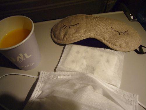 旅の必需品、touchのアイマスクと就寝用の濡れマスクで乾燥予防。ちょっとウトウトしたら着陸態勢に入っていました。 -
