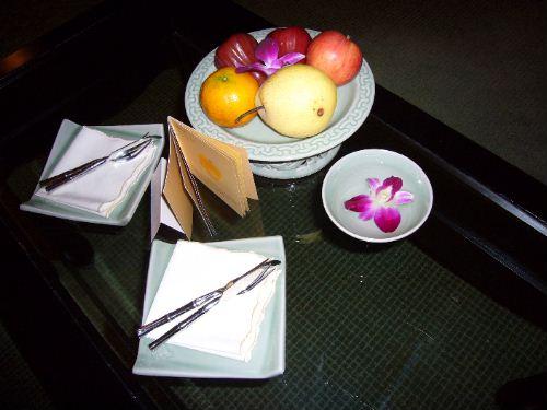 旅先で疲れたがリフレッシュしました。施術前にはおしぼりと冷たいお茶が、施術後には温かいお茶と南国のカットフルーツが出されました。
