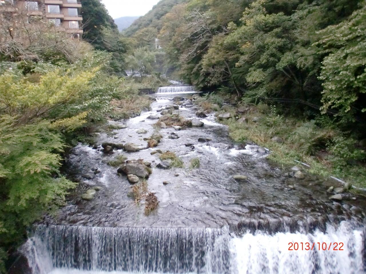 駅からバスでホテルへ。ホテル前の川。紅葉はまだですね。