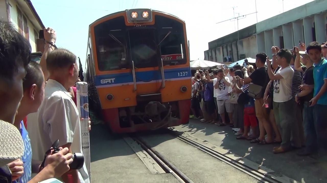 線路の真横のメークロン市場です。