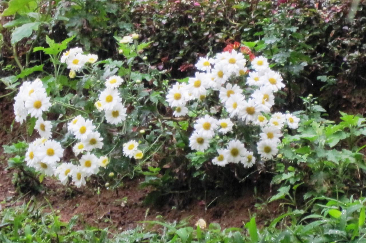 白い小菊の花です。右後ろに、オレンジ色の花も見えました。小菊は、花の径が1〜3センチのものを指します。それより大きければ中菊です。キク(菊)は、キク科キク属の植物です。