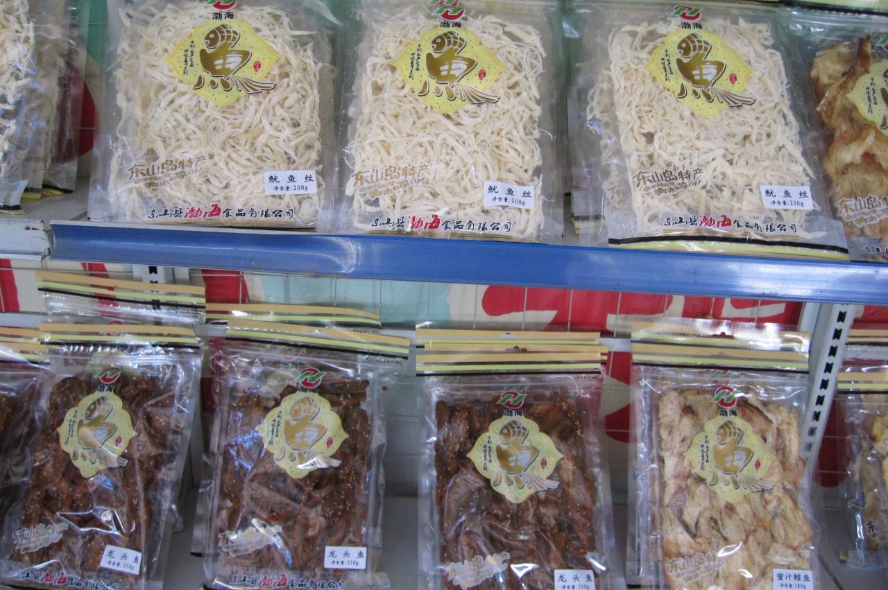 海産物も一緒に売られていました。ショウ州市は海に面した区域もりますので、海産物としては、海老、ハタ、アワビなどがあります。『東山島』の産地が記された干物や、胡麻をまぶした味醂干しです。