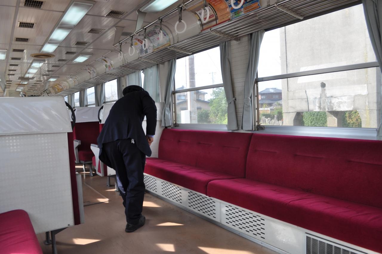折り返し時間を利用して、運転士自ら車内清掃です。