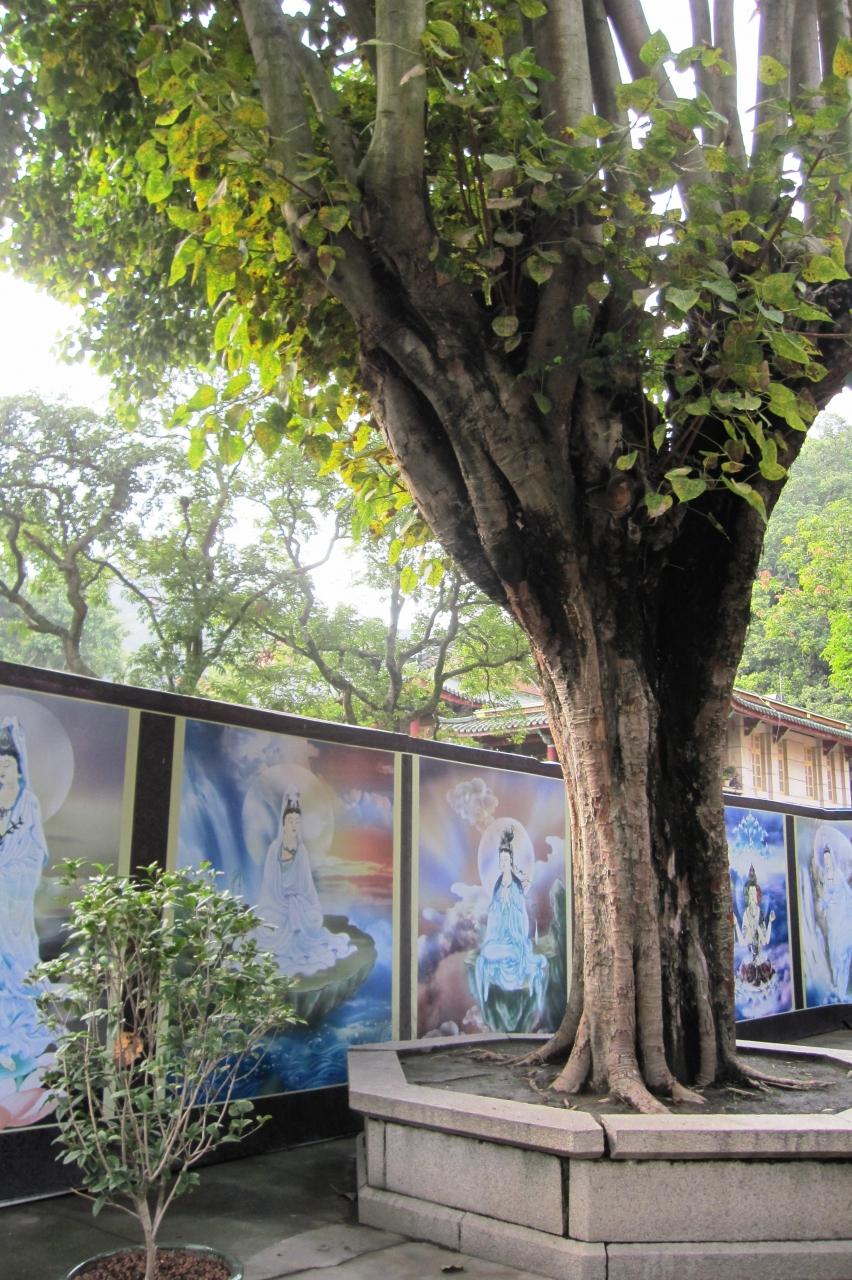 大木とその周りに仏画が飾られた境内の光景です。仏画は薬師如来や観音菩薩像などが多いようでした。往きにも一部を撮影しました。
