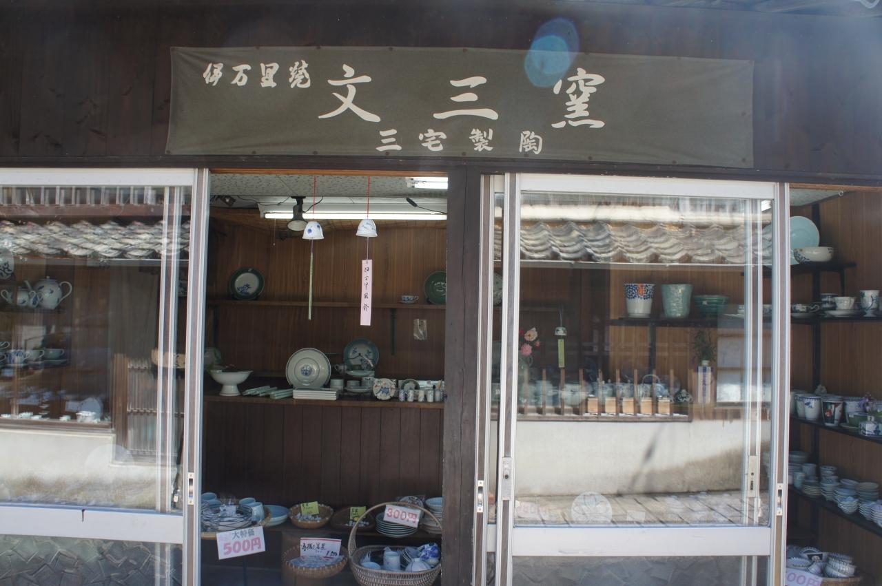 文三窯は、大川内山の中ほど。この辺りは、小さな窯元がたくさんあって、ここもそんな中の一つ。外から店内を覗くと、もうだいたいが分かってしまうような感じです。店先に、ちょっと安売りの商品を置いてみたりしていますが、逆に元気のない感じがしてしまうかもしれません。
