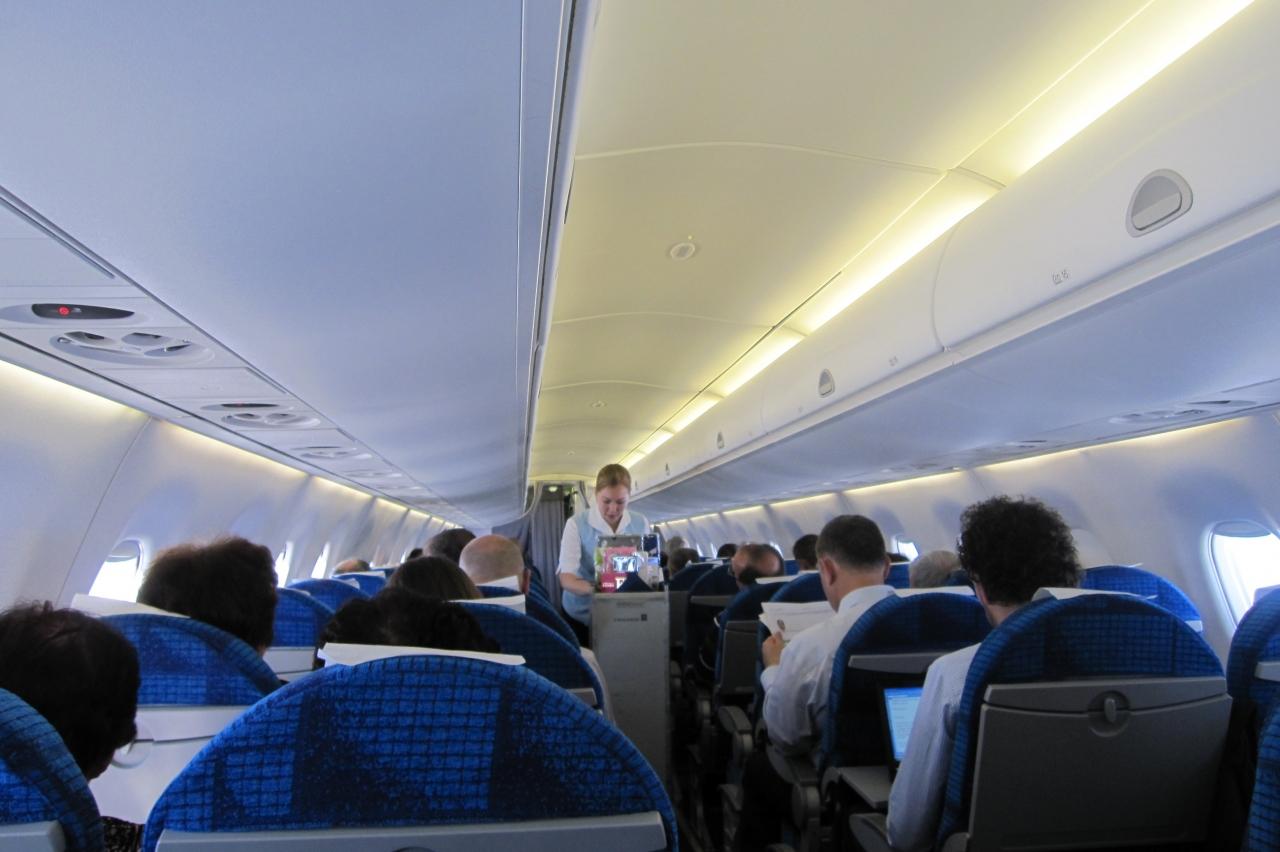 搭乗したばかりのフィンエアーの機内光景です。何度も利用したことがある航空会社ですが、100人弱のローカル線ですから、機内サービスに期待はできません。
