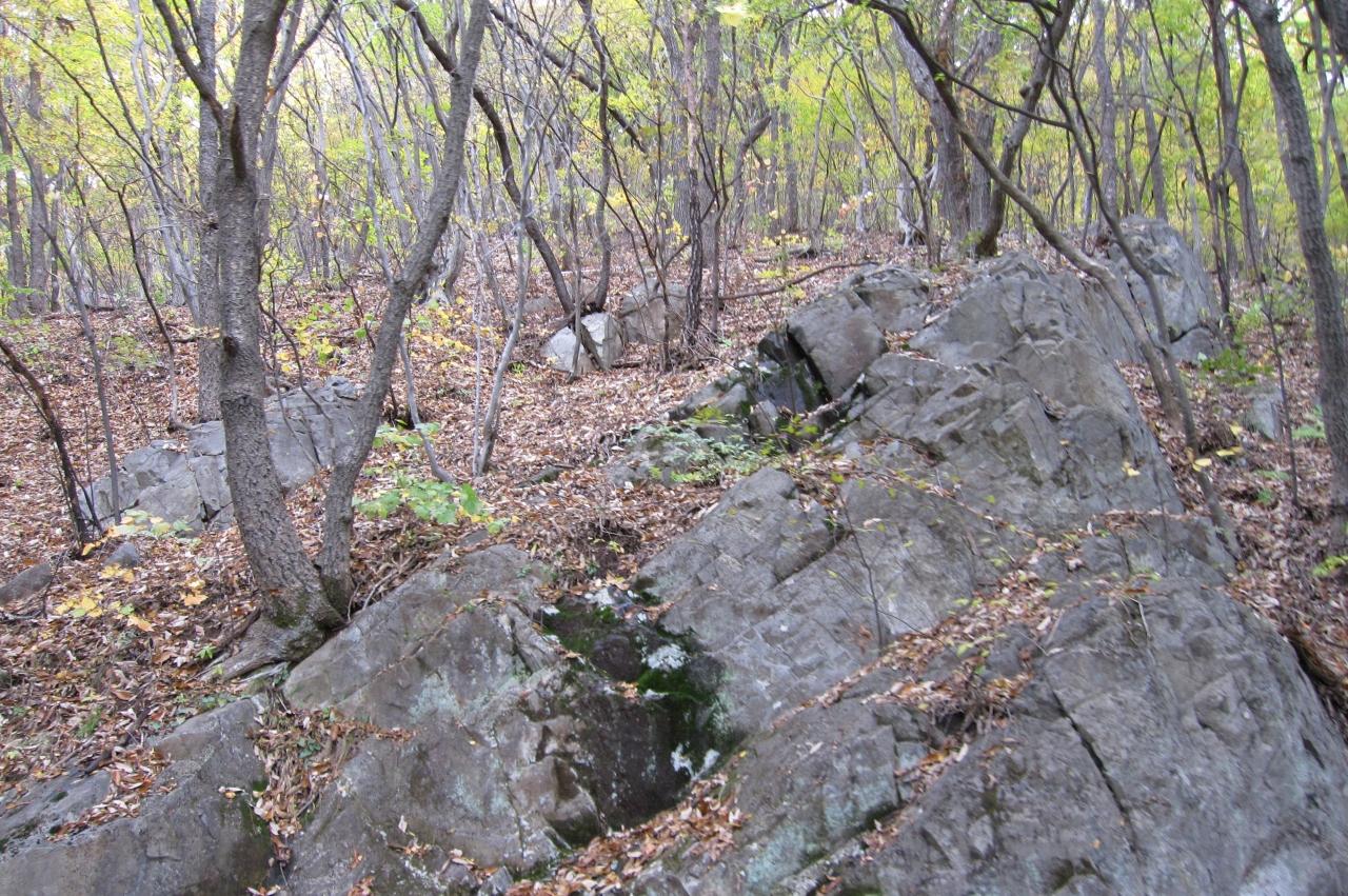 麓で車を下りて、少し長い距離を歩いて梵魚寺の見学です。上り坂の脇にあった雑木林の光景です。大きな岩がむき出しになっていました。