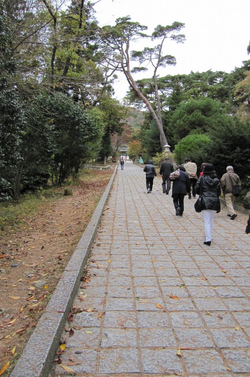 梵魚寺の入口に当たる一柱門に向かう石畳の参道の光景です。少し骨が折れる、緩やかな上り坂になっていました。