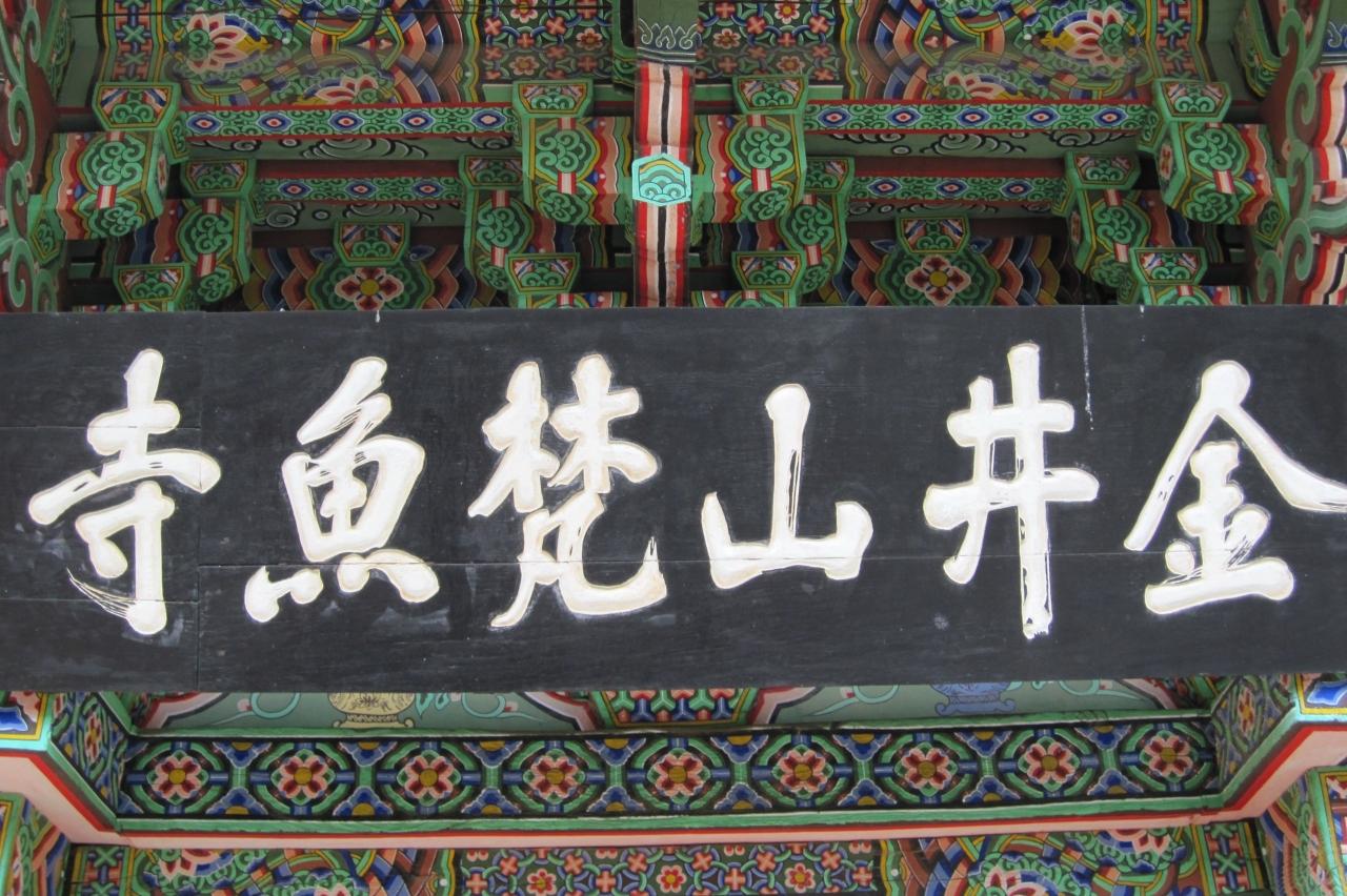 『金井山梵魚寺』の扁額のアップ光景です。ハングル読みでは『キムジョンサン・ポモサ』です。韓国五大寺院の一つに数えられます。『曹渓門』の扁額の左側にあります。