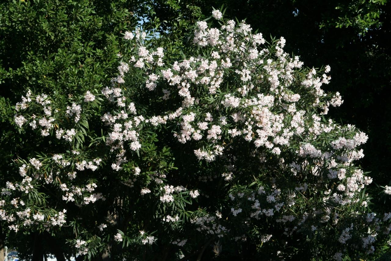 白いキョウチクトウ(夾竹桃)の花の光景です。キョウチクトウ科キョウチクトウ属の常緑低木もしくは常緑小高木です。世界の多くの国で見かける樹木の一つです。
