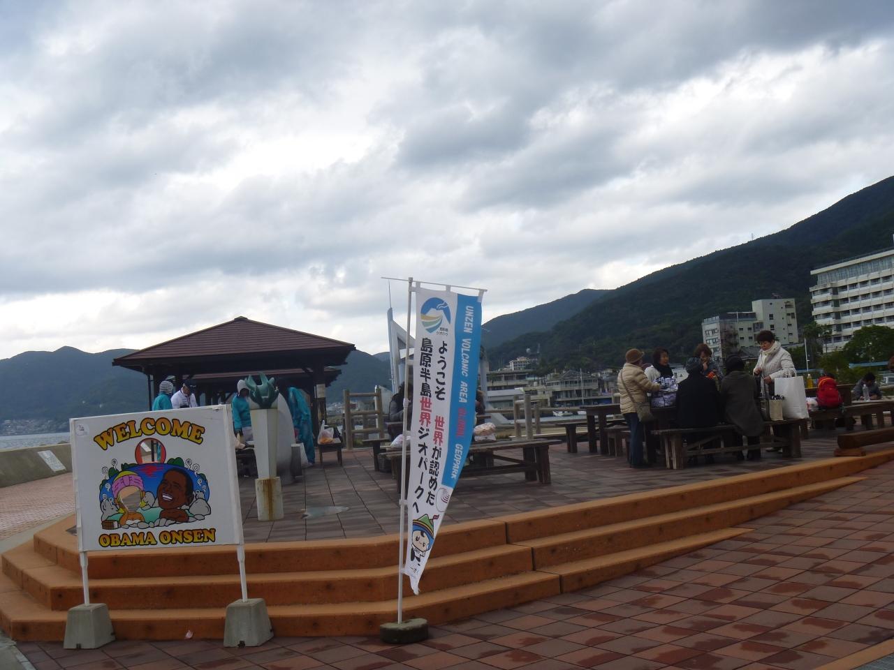 ちょうどお昼時に小浜温泉に着きました。小浜マリンパークの駐車場は有料。目の前が今晩泊まる旅館ゆのか。お願いしたらこころよく駐車させてくださいました。