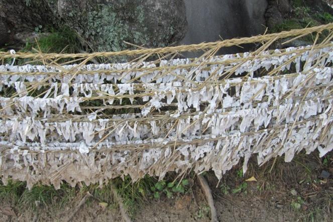 縄にびっしり結わえられた御神籤のアップ光景です。河回村の家々は、この御神木に向かって建てられているため、向きが一定ではないようです。(同上)