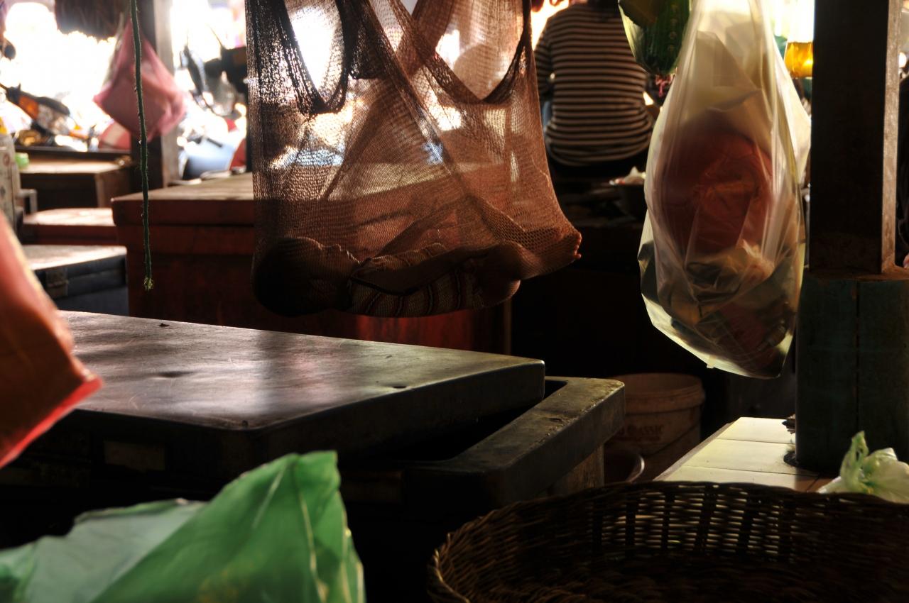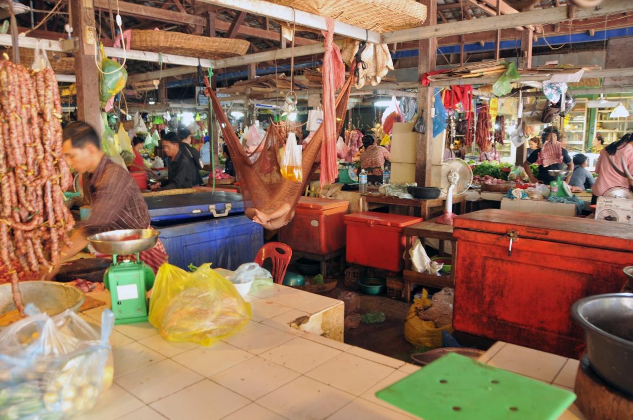 シェムリアップの市場です。ハンモックに小さな子供を寝かしつけてます。