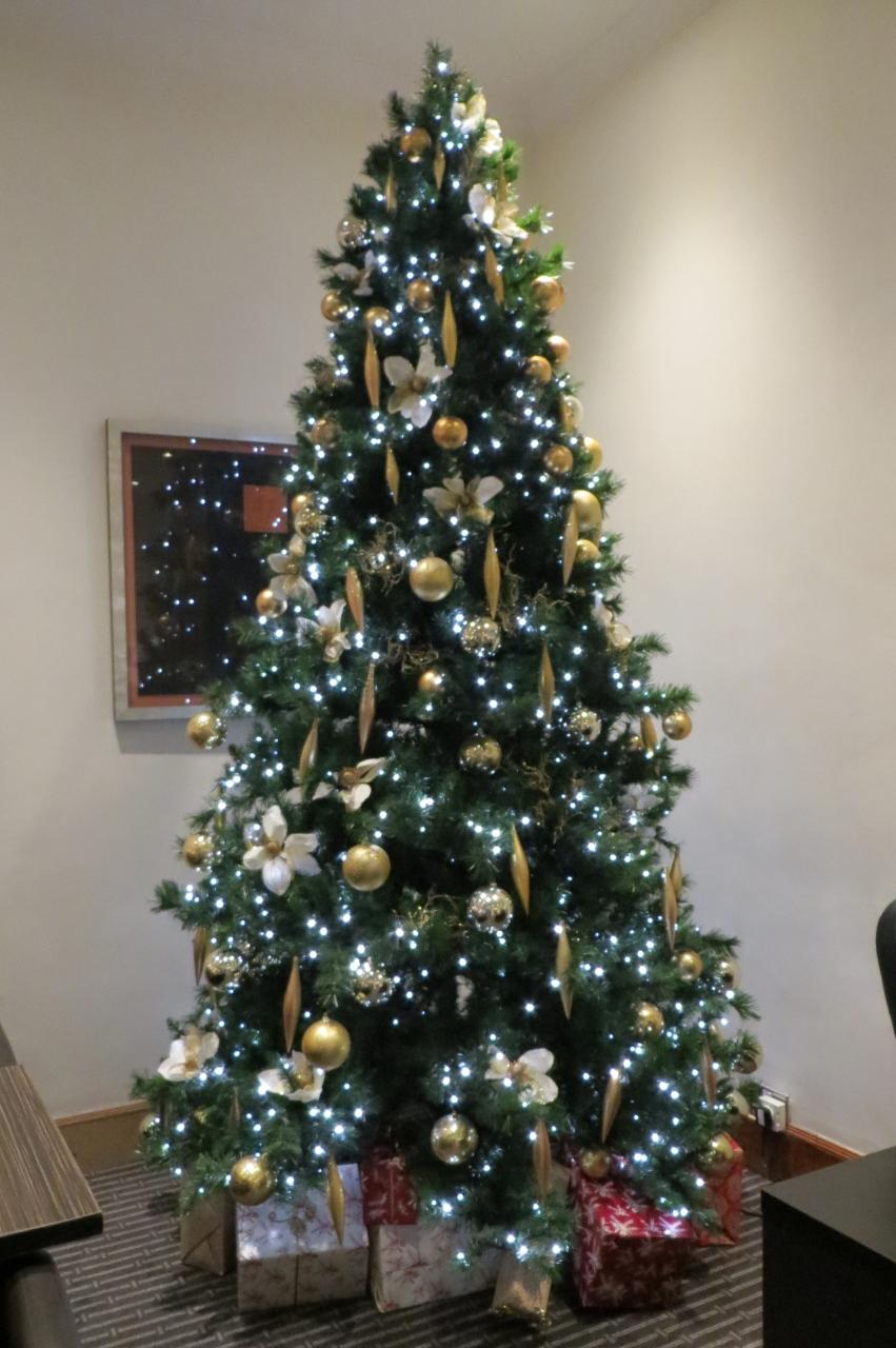同じ1階のロビーですが、離れた場所に飾ってあったクリスマス・ツリーの光景です。白と金色に統一された飾りでした。こちらにもクリスマス・プレゼントの箱が雰囲気を盛り上げていました。