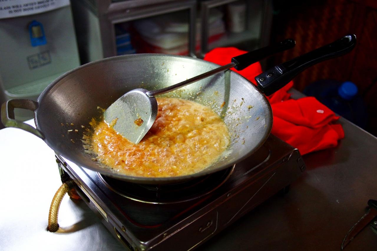 豚の皮はクロック(石臼)で潰して、そこに材料と調味料を加え、中華鍋で煮詰めココナッツパウダーを足して色が変わったら完成。