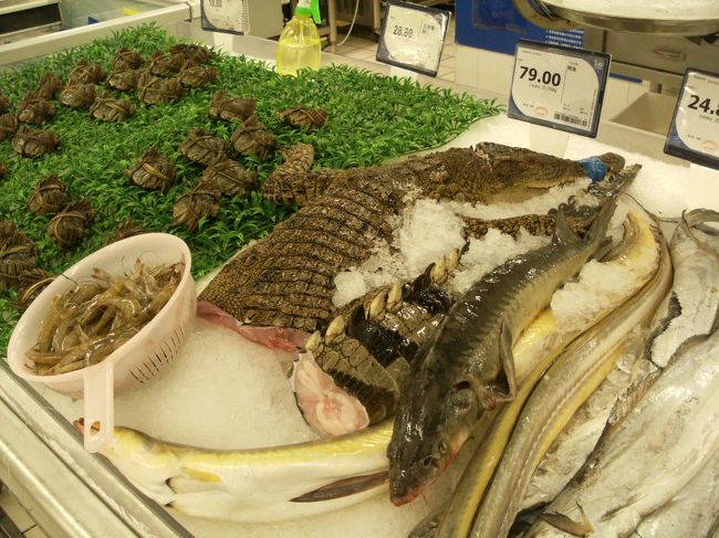蟹や蝦と並んで胴体を真っ二つにされた鰐が普通に売られてる。