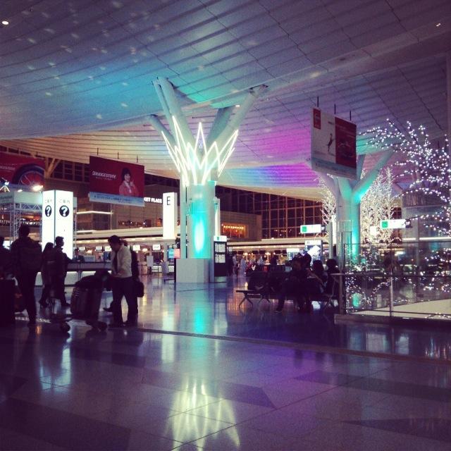 一人で旅行はそれなりに慣れてるはずなのですが、どうも飛行機に乗ると思うとテンションが上がってしまう私は、全く寝ることができず、とりあえず空港を探検。クリスマスイルミなどもあってけっこうキレイでした。シーンとした空港もまた心落ち着くというか、面白い経験でした。