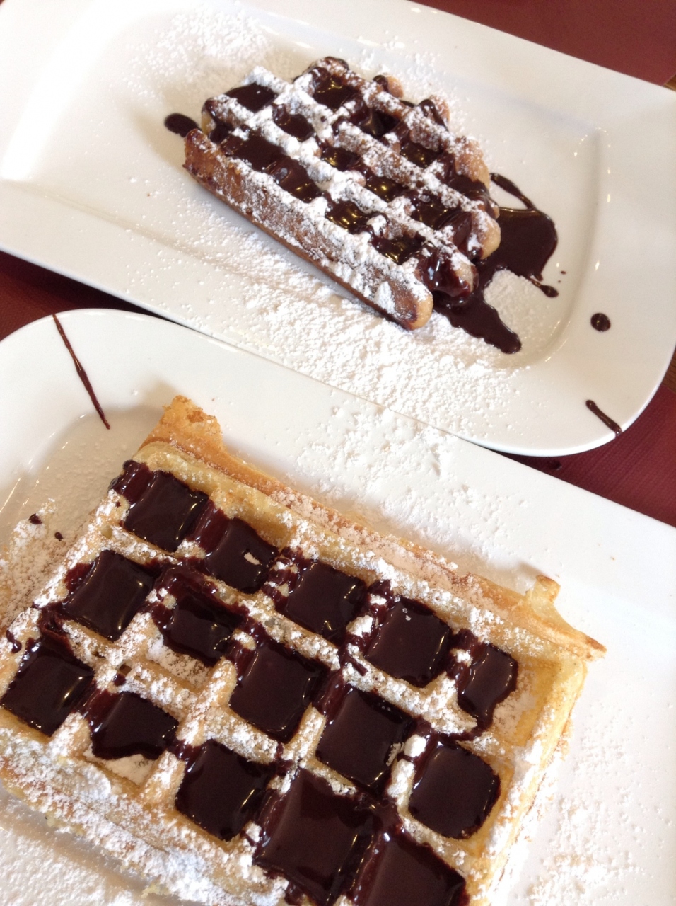 ブリュッセルワッフルとリエージュワッフルのチョコレート掛けを注文。お友達と半分ずつにしてお味を確認!