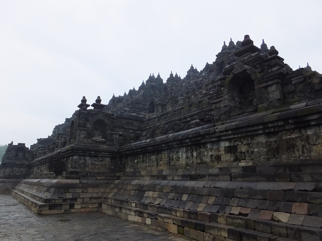 5amバンに乗り、ボロブドールに6:15am着。入場料Rp.190000を払い、中に入る。今日も朝から小雨が降っている。多くの地元の学生団体が来ていたので人で埋め尽くされていた。たった2時間しかなく、早足で各回廊のレリーフを見て回る。晴れていれば遺跡自体、もっと見応えがあったのに。2回目もあり、あまり感動しなかった。8:15amに食堂で朝食。ボロブドールを9am出発。 -