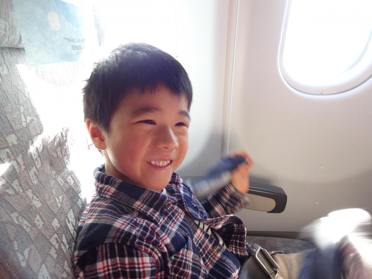 機内の息子、ルンルンです!中耳炎にならないよう、離着時はガムをかませました。 -