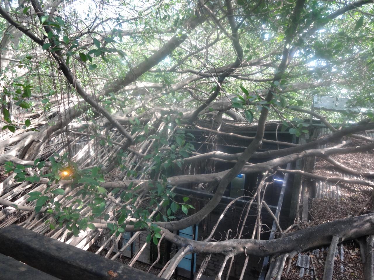 ガジュマルの木が生い茂って、倉庫を覆い尽くしていました。 -