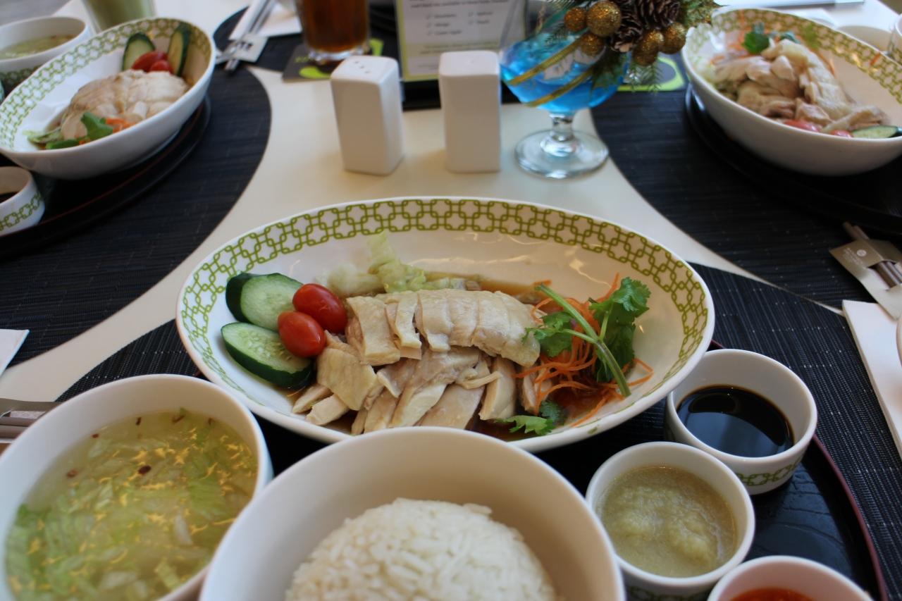 スープ、ジャスミンライス、蒸し鶏の3種のソース添え