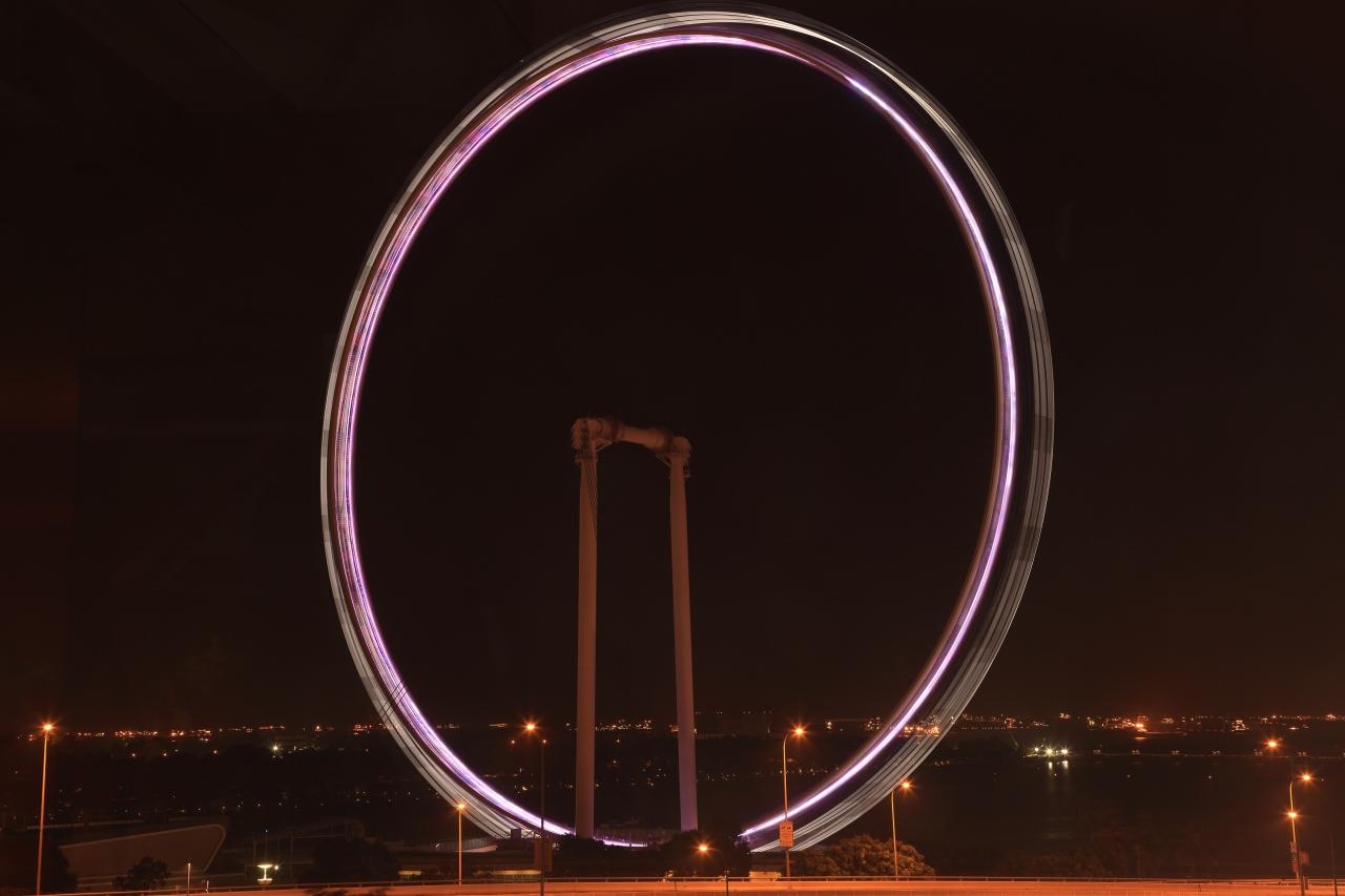 バスルームから見たシンガポールフライヤーと朝日。 -