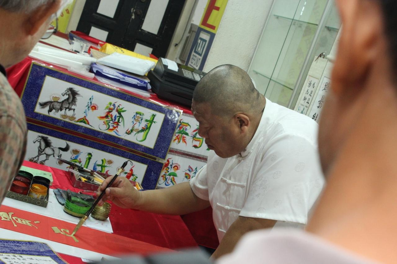 覗いてみると、金色の墨?で「富貴平安」と書いているお店の方がいました。